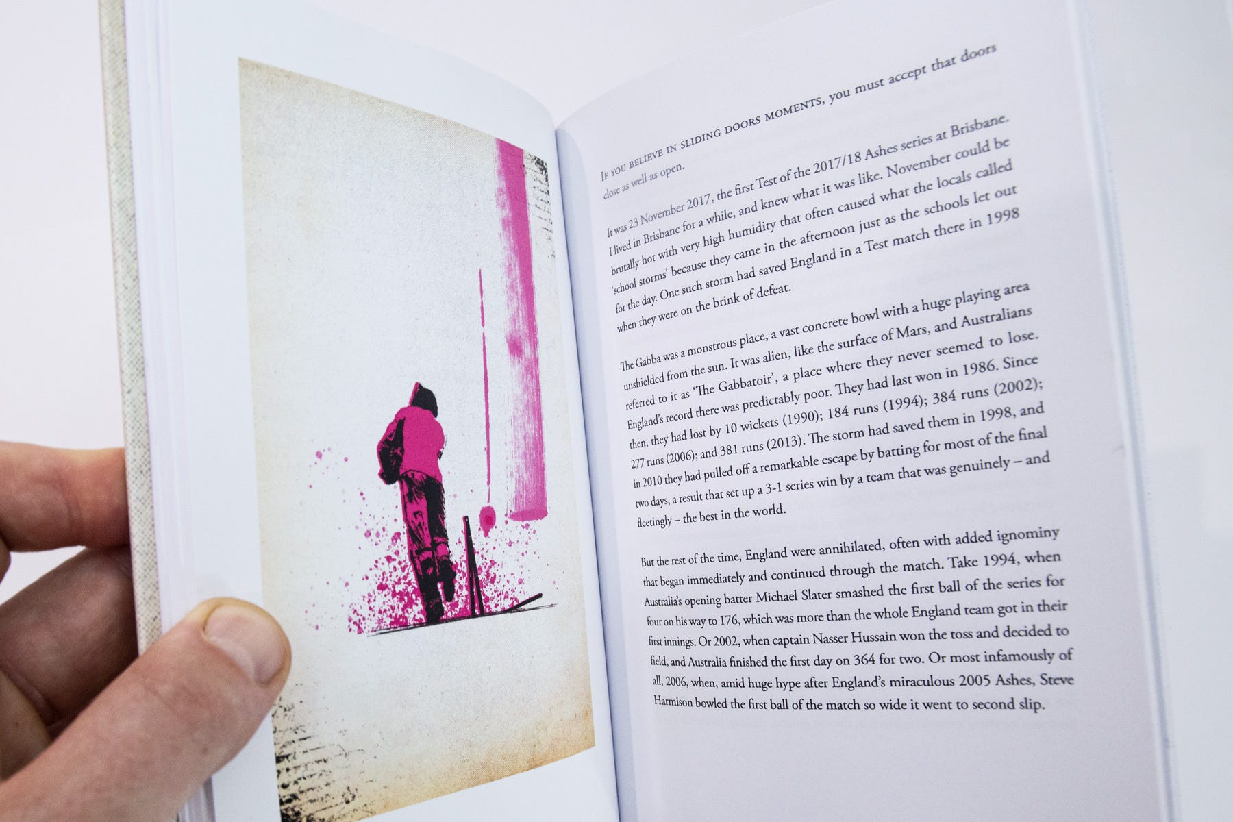 Through our initial discoveries, Jon and I agreed that this book should be a unique experience for the reader. At 90 pages, it was a small novella of vignettes about cricket, art and life. The project presented opportunities for some bespoke creativity.
